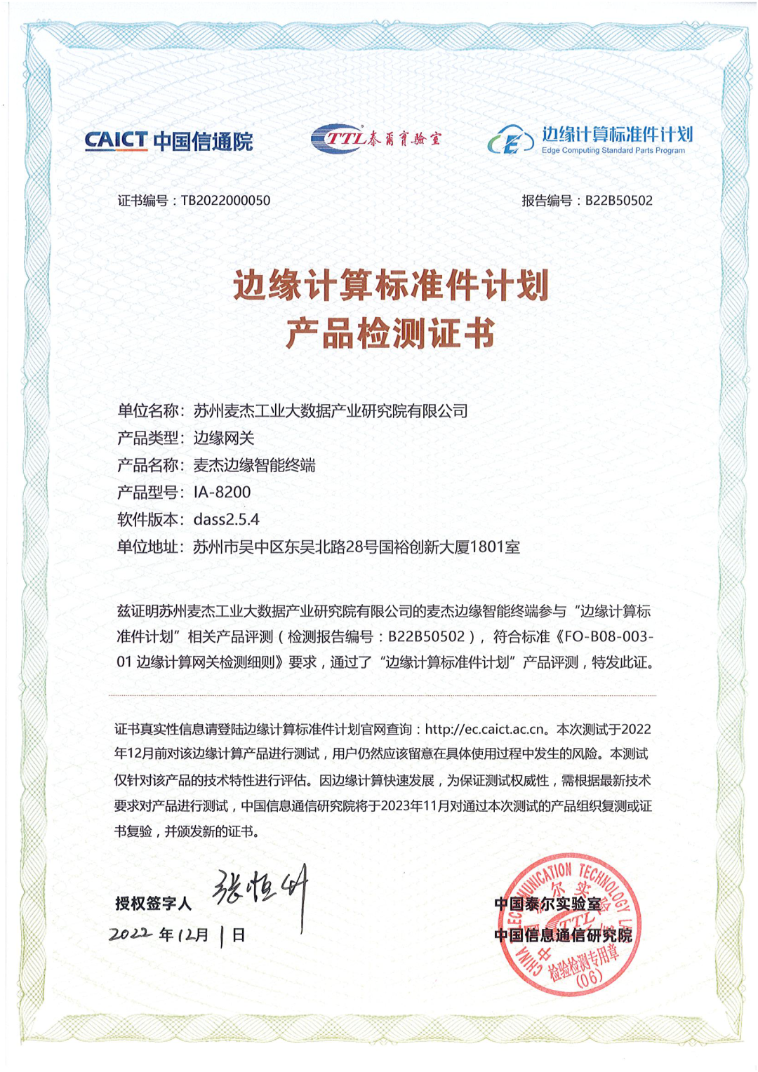 “邊緣計(jì)算標(biāo)準(zhǔn)件計(jì)劃”證書(shū)