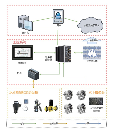 本方案包含四個(gè)部分:礬花視頻采集系統(tǒng)(功能:視頻信號(hào)采集、傳輸機(jī)器視覺(jué)等)、邊緣智能終端系統(tǒng)(功能:圖像灰度處理、投加量動(dòng)態(tài)計(jì)算等)、自動(dòng)加藥系統(tǒng)(功能:自動(dòng)加藥控制等)、廠級(jí)云平臺(tái)管理系統(tǒng)(功能:廠級(jí)監(jiān)控中心等)。