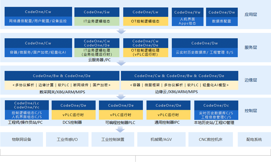 CodeOne工控軟件平臺面向不同設備廠商大/中/小型可編程邏輯控制器(PLC)和IPC提供統(tǒng)一無代碼組態(tài)編程環(huán)境、無差別編譯器與標準化運行時,軟件功能覆蓋工控系統(tǒng)的控制層、邊緣層、服務層和應用層(見下圖),支持“數(shù)據(jù)采集-智能處理-應用開發(fā)-反向控制”全鏈條閉環(huán)。控制層可集成軟PLC運行時內(nèi)核,支持多種異構PLC/IPC硬件;邊緣層可支持EtherCAT、Profibus、OPC UA、MQTT等多種協(xié)議,集成邊緣計算、斷網(wǎng)續(xù)傳、國密算法;服務層集成容器、微服務技術和輕量化大語言模型,支持大容量數(shù)據(jù)存儲、周期定時/事件觸發(fā)/接口交互等多種類型的復雜邏輯編排處理服務;應用層集成支持IT與OT融合的PLC無代碼組態(tài)編程工具,支持端邊云協(xié)同的運動控制和PLC多機集群分布式控制等多種應用。