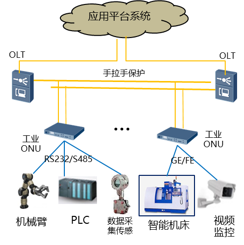 通過在生產(chǎn)線部署工業(yè)PON網(wǎng)絡(luò)(包括OLT、ODN以及ONU等),實(shí)現(xiàn)生產(chǎn)現(xiàn)場(chǎng)設(shè)備和監(jiān)控中心/云端互聯(lián)。組網(wǎng)架構(gòu)如下: