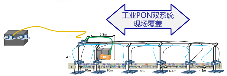 生產(chǎn)信息流網(wǎng)絡(luò)(工業(yè)PON)采用2級(jí)分光,OLT到第一級(jí)分光器采用2:8分光,分光器部署在強(qiáng)電槽橋架內(nèi),OLT到分光器采用Type B保護(hù),以提升網(wǎng)絡(luò)的可靠性。二級(jí)1:8分光,部署在對(duì)應(yīng)槽位的立柱上,86盒式ONU安裝在線槽的立柱上,整體施工部署如下: