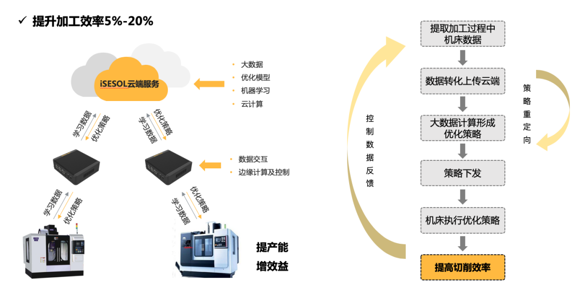 iSESOL 智能增效應用在不改變原有機床加工程序的基礎上,通過智能化的算法識別與學習,生成基于該工況下唯一的優化策略,通過該策略指導后續加工過程,對機床進行智能化調控,能夠提升機床加工效率平均達10%以上。通過預設的人機交互界面,終端用戶可以對設備運行的多種環境因素進行錄入,同時再結合實時的數據采集、學習和控制結果反饋,對優化策略不斷進行歸集和調整。