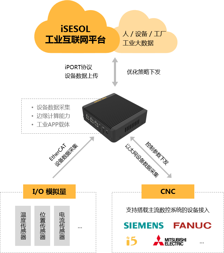 智能云科信息科技有限公司自主研發的邊緣計算網關——iSESOL BOX,具備工業協議適配、工業現場設備數據采集與邊緣計算能力,結合iSESOL工業互聯網平臺的云服務產品,形成“云+邊緣”的工業互聯網技術架構及服務能力,為機加工企業提供設備狀態監控、生產效率提升及設備全生命周期維護等能力支撐。