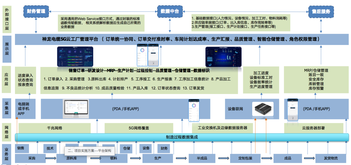 神龍電纜5G云工廠項目建設總體架構主要分為:業務層網絡層數采層、應用層展示層與邊緣層