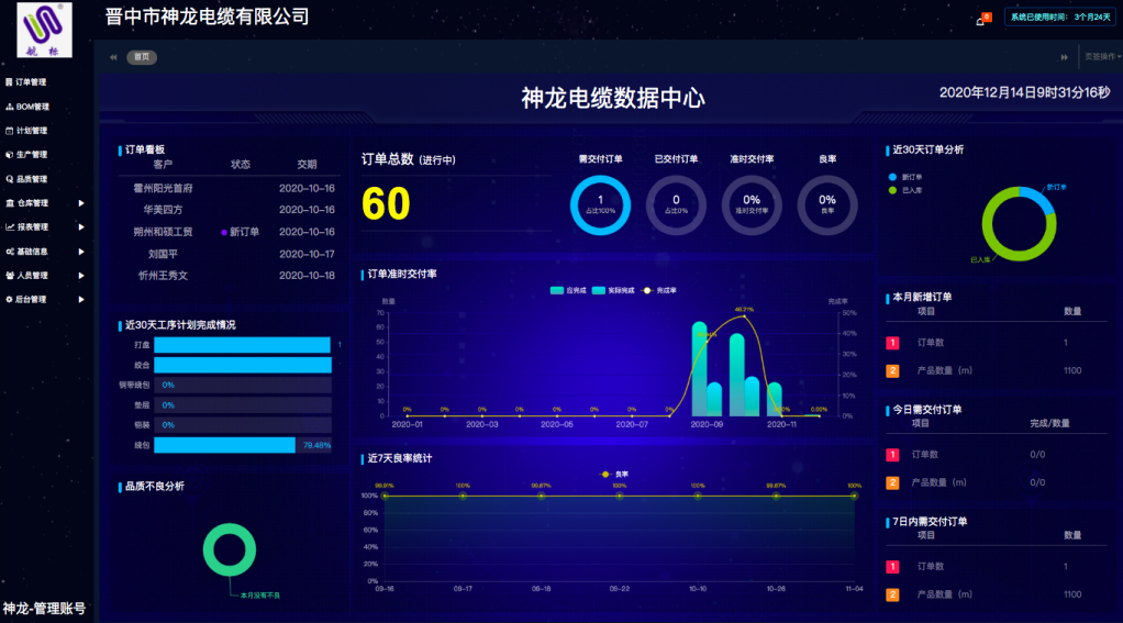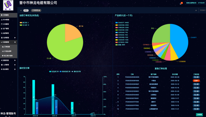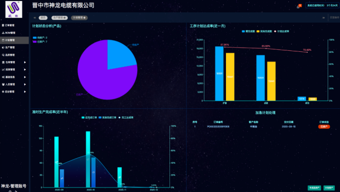 隨著神龍電纜企業規模的擴大公司業務快速成長,訂單數量逐年成倍增長,靠原有的生產管理模式已無法滿足企業發展的需要。面臨的主要問題是訂單種類多,客戶下單頻度高,無法及時掌握訂單交付進度,產品生產周期長,內部生產計劃組織混亂,生產協同性差,重點設備管理混亂無法監控設備生產狀態導致產能不足,資源整體利用率低,同時隨著電線電纜的定制化程度增加生產與精密加工對企業的協同設計、協同生產、協同供應鏈提出了更高的要求,大量的技術工藝原料檢測、生產協同生產加工數據需要記錄、分析、反饋、決策。