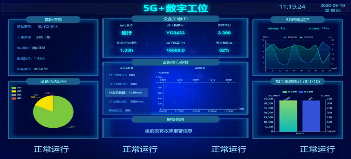 將設備核心參數進行采集及控制,提升了設備穩定性與高效自主調整能力,利用5G靈敏度傳輸,是現實設備核心參數波動的及時反饋,利用5G低延時技術實現數據與服務器的快速調取,將波動數據快速調整到標準值域,通過邊緣數據處理實現設備自感知、自判斷、自調整、自適應,為高效產出及產品穩定性提供了核心技術保證。