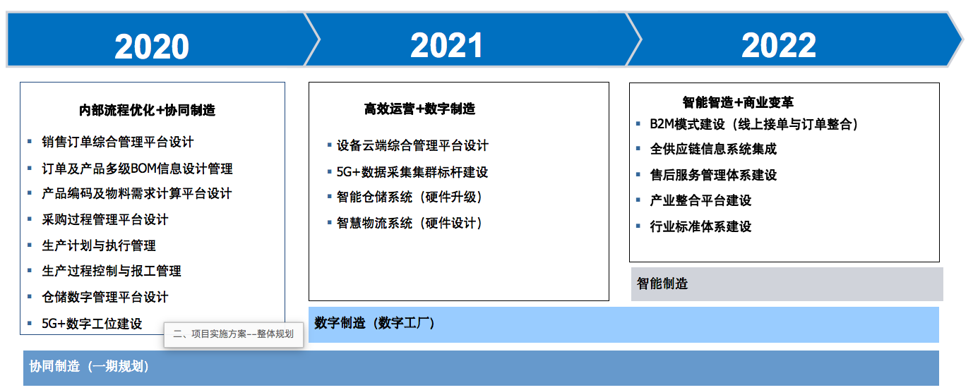 一期(2020)主要以內部流程優化及協同制造為目標,重點市對企業內部制造過程進行數字化升級改造,建立5G云工廠管理平臺。