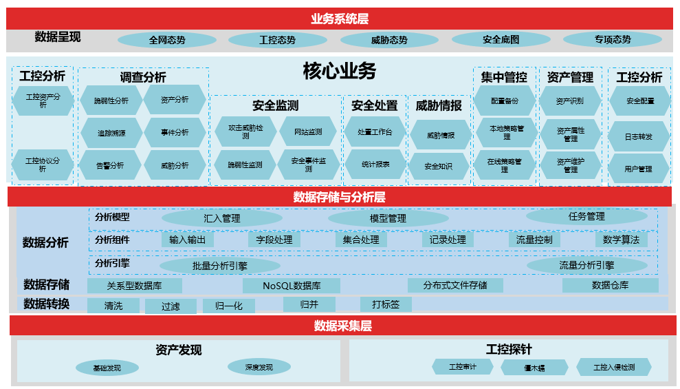構(gòu)建企業(yè)級(jí)態(tài)勢(shì)分析系統(tǒng),圍繞企業(yè)內(nèi)部工業(yè)網(wǎng)絡(luò)數(shù)據(jù),構(gòu)建態(tài)勢(shì)應(yīng)用包括態(tài)勢(shì)感知數(shù)據(jù)交互式檢索、工控?cái)?shù)據(jù)實(shí)時(shí)監(jiān)測(cè)、態(tài)勢(shì)分析模型、安全風(fēng)險(xiǎn)快速處置、工業(yè)安全問(wèn)題追蹤溯源等功能。