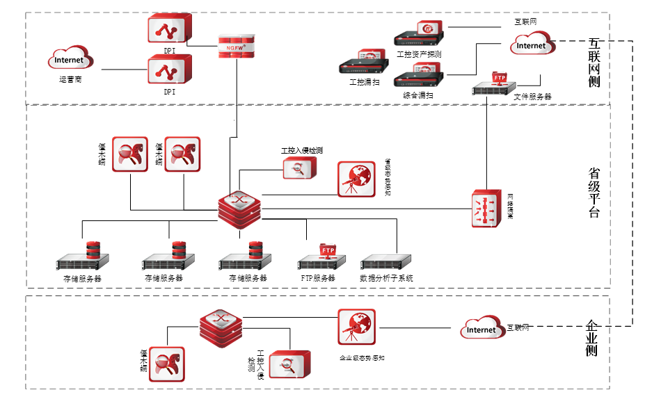 本項(xiàng)目主要是在互聯(lián)網(wǎng)側(cè)、省級(jí)平臺(tái)和企業(yè)側(cè)實(shí)施的部署:在互聯(lián)網(wǎng)區(qū)(運(yùn)營(yíng)商)部署漏掃產(chǎn)品,通過(guò)網(wǎng)絡(luò)隔離設(shè)備導(dǎo)入內(nèi)網(wǎng)FTP服務(wù)器,再接入省級(jí)平臺(tái),向省級(jí)平臺(tái)傳輸監(jiān)測(cè)數(shù)據(jù),部署DPI流量分析設(shè)備,可為工控入侵檢測(cè)提供原始工控流量,為僵木蠕提供全網(wǎng)抽樣流量;省級(jí)的態(tài)勢(shì)感知平臺(tái)部署在核心區(qū),通過(guò)對(duì)接收的企業(yè)側(cè)和互聯(lián)網(wǎng)側(cè)的檢測(cè)數(shù)據(jù)進(jìn)行綜合分析,實(shí)現(xiàn)省級(jí)工業(yè)互聯(lián)網(wǎng)安全全面及實(shí)時(shí)的監(jiān)測(cè);在某省企業(yè)區(qū)域部署企業(yè)級(jí)的態(tài)勢(shì)分析系統(tǒng)及僵木蠕、工控審計(jì)等探針,向省級(jí)態(tài)勢(shì)感知平臺(tái)提供監(jiān)測(cè)數(shù)據(jù)。
