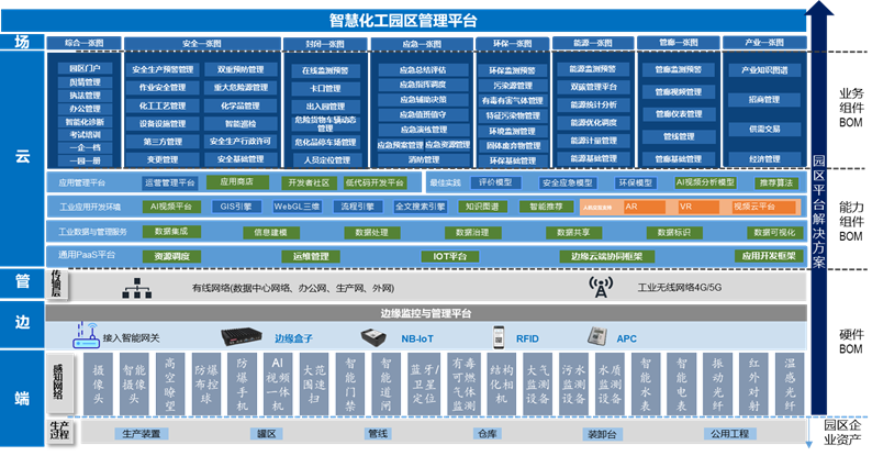基于“園區OS+工業APP”的模式,聚焦安全、環保、應急、能源、產業鏈分析等9大場景,全面整合園區信息資源與技術平臺,布局園區綜合一張圖、安全生產一張圖、環境管理一張圖、應急管理一張圖、經濟能源一張圖,建立集安全、環保、應急救援、能效分析、封閉管理、物流跟蹤、公共服務、產業鏈分析等多種功能于一體的信息化管理平臺。推動園區信息系統和公共數據互聯互通、開放共享,實現化工園區數據集中、整合、智能分析,進而逐步實現對化工園區安全、環境、能源、物流等重點防控面的智能預警與分析評價。創新“園企共建”模式,以輕量化SaaS產品賦能園區內企業,實現園區和企業數字化轉型升級。