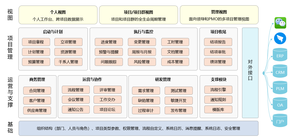 系統基于不同的角色,提供不同的功能視圖:個人視圖、項目視圖、和管理視圖。