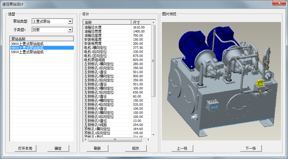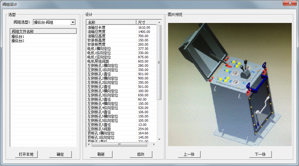 在“閥組選型”中可選擇當(dāng)前定義的泵站結(jié)構(gòu),目前有“操縱臺-閥組”、“馬達(dá)-閥組”與“支架-閥組”,類型可擴(kuò)展;在“閥組文件名稱”列表中,可選擇當(dāng)前類型下的所有閥組種類。