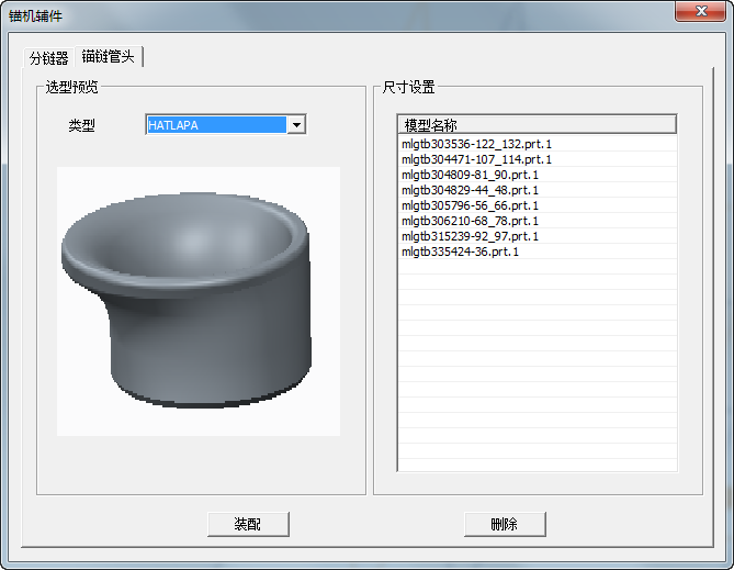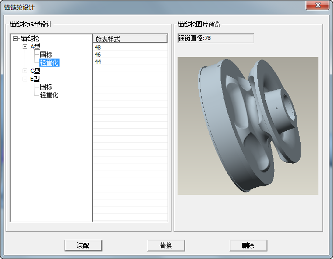 可選擇需要的錨鏈輪種類,錨鏈輪均為族表樣式,可進(jìn)行新建裝配,替換選型以及刪除動作;可及時(shí)看到當(dāng)前設(shè)計(jì)要求選用的錨鏈直徑是多少,可根據(jù)此數(shù)值作為選型參考;在此功能區(qū),可自定義截圖作為選型參考。