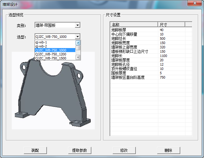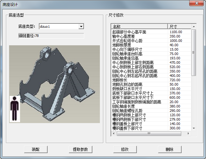 在“底座類型”中,可通過下拉菜單選擇需要的底座模型,下方為圖片預(yù)覽。可通過此尺寸列表,修改模型中的相關(guān)尺寸信息,具體操作方式為:點(diǎn)擊“提取參數(shù)”在模型樹中選擇底座總成選擇完成后將會在此表中將模型中可調(diào)整的參數(shù)顯示出來修改尺寸信息在功能按鈕區(qū)域點(diǎn)擊“修改”,通過此流程將可以修改相關(guān)尺寸信息。
