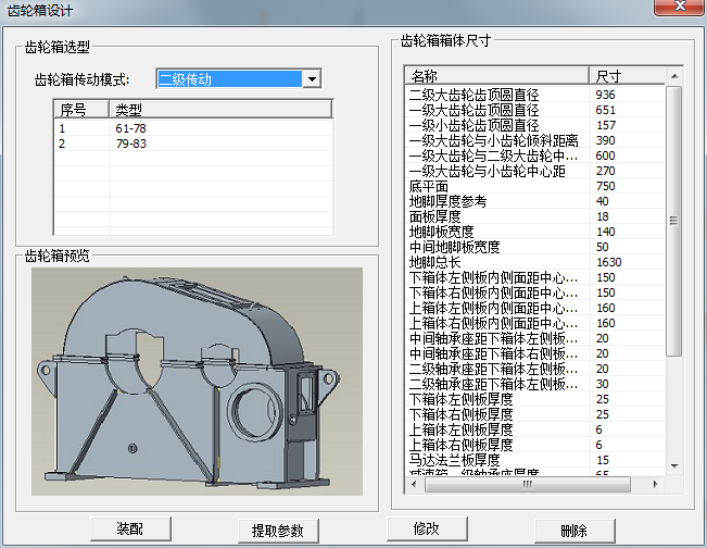 在選型界面可選擇需要的齒輪罩類型,類型可擴(kuò)展。可通過“提取參數(shù)”功能,將當(dāng)前模型中的數(shù)據(jù)提取到尺寸設(shè)計(jì)表中,可自定義相關(guān)尺寸,點(diǎn)擊“修改”可將當(dāng)前值傳遞到模型。