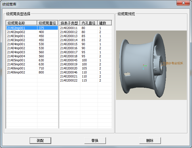 絞纜筒為族表形式,在左側(cè)對話框中選擇絞纜筒的結(jié)構(gòu),在右側(cè)對話框中選擇具體的規(guī)格,在右側(cè)對話框中可了解到當(dāng)前具體的子類型中的內(nèi)孔直徑以及鍵數(shù)等關(guān)鍵參數(shù)信息。