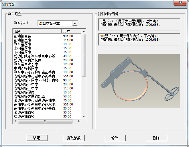 在剎車設(shè)置對話框下,首先是剎車選型,其中包含當(dāng)前定制的剎車選型結(jié)構(gòu),可擴(kuò)展。在剎車選型下方是參數(shù)界面,可對相關(guān)參數(shù)進(jìn)行微調(diào),點(diǎn)擊“修改”,可將當(dāng)前參數(shù)信息傳遞到模型中并更新模型。