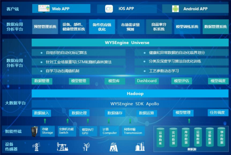 智能終端做為智擎工業(yè)設(shè)備數(shù)據(jù)采集運算終端,可以與設(shè)備PLC 通信,把傳感器的實時數(shù)據(jù),錄波數(shù)據(jù)采集出來,并且作為端的運算終端,針對實時的數(shù)據(jù)進(jìn)行初步的運算,然后進(jìn)行大數(shù)據(jù)平臺的數(shù)據(jù)接入,可以支持?jǐn)?shù)據(jù)的斷點續(xù)傳。WYSEngine SDK Apollo 作為產(chǎn)品數(shù)據(jù)接口的 SDK 組件,運行與 Hadoop 大數(shù)據(jù)平臺執(zhí)行,按照工業(yè)設(shè)備的數(shù)據(jù)應(yīng)用場景進(jìn)行功能組件的封裝,實現(xiàn)從數(shù)據(jù)的接入、數(shù)據(jù)處理、數(shù)據(jù)存儲、數(shù)據(jù)運算、模型管理和任務(wù)調(diào)度等功能,為上層應(yīng)用提供平臺級的支撐。