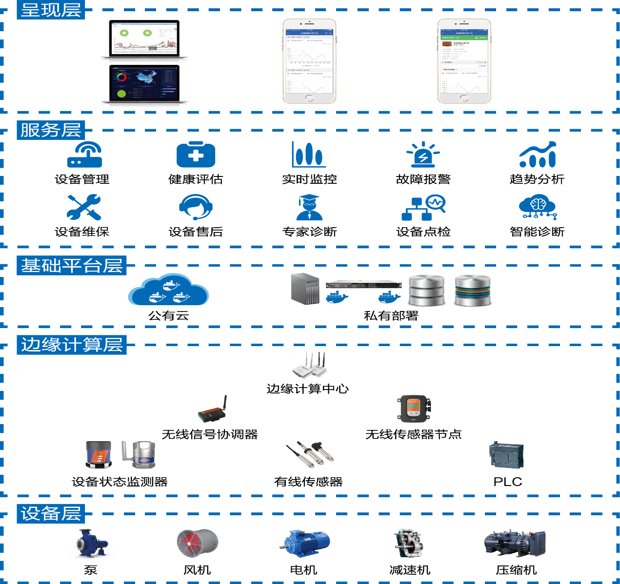 系統(tǒng)主要由設(shè)備層、邊緣計(jì)算層(含傳感檢測(cè)、數(shù)據(jù)采集、數(shù)據(jù)傳輸、邊緣計(jì)算)、基礎(chǔ)平臺(tái)層、服務(wù)層及客戶(hù)端呈現(xiàn)操作層組成。系統(tǒng)包括狀態(tài)傳感器、網(wǎng)絡(luò)協(xié)調(diào)器(或PLC、DCS控制器)、遠(yuǎn)程智能傳輸單元、遠(yuǎn)程服務(wù)器、服務(wù)系統(tǒng)、遠(yuǎn)程PC客戶(hù)端及移動(dòng)客戶(hù)端。