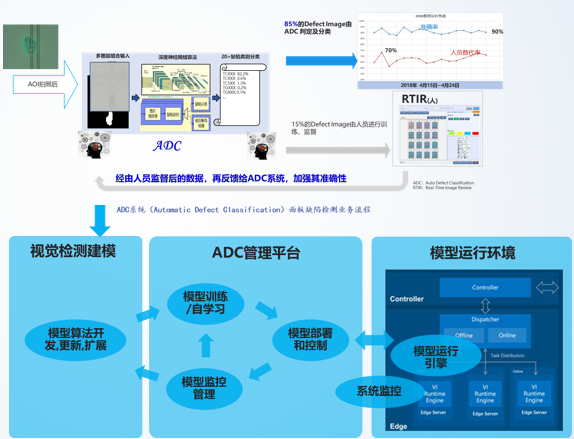 為了解決以上的問題和痛點,格創東智在華星光電導入了一套基于格創AI應用平臺的自動缺陷分類系統,將人工智能算法與AOI設備結合,通過系統中的圖像識別算法以及深度學習算法,對各制程多種類的缺陷圖片進行學習訓練及建模,開發出具備自主學習能力的檢測模型,代替了大量人工,實現了無間斷、高精準的缺陷自主檢查判定功能。該系統也與生產良率系統對接,實現了自動判定、異常報警、自動攔截等功能。在系統管理平臺中,廠商可以自主完成模型訓練,模型部署和模型管理,方便后期針對新產品以及新缺陷進行模型擴展和自訓。