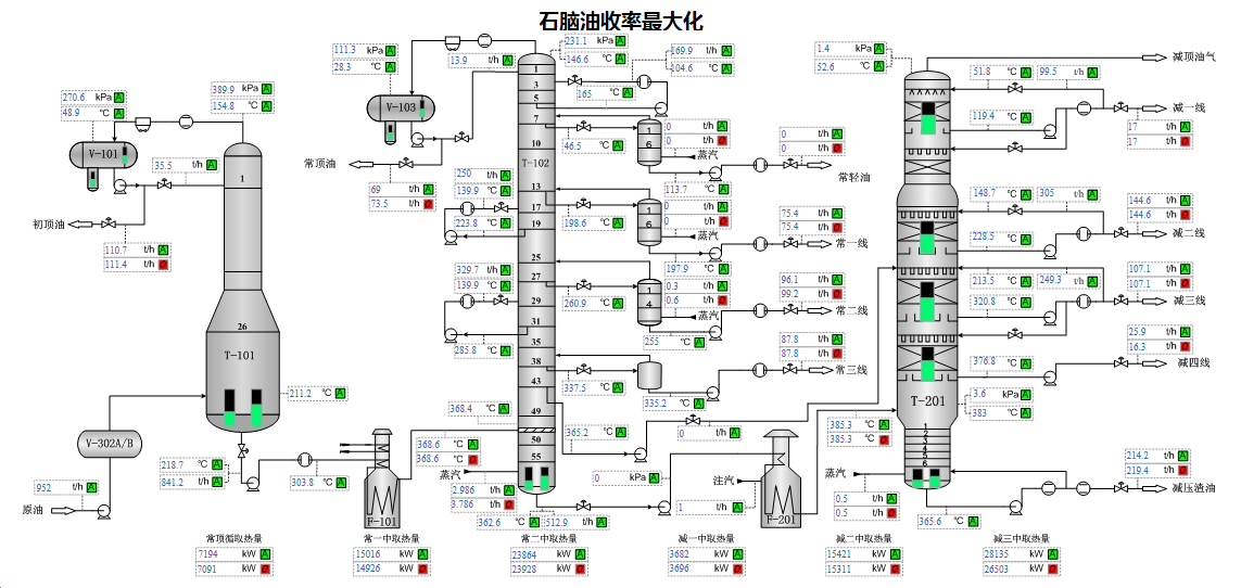 提供生產裝置優化解決方案,對生產過程的操作方案、工藝技術參數、裝置潛力和瓶頸等進行經常性的定量分析和診斷,優化裝置生產操作。把原油調合成套裝備與原油近紅外快評工具、原油加工優化軟件深度融合,實現了對近百余種原油配方優化和組分的精確控制,原料組分穩定可控,確保了常減壓裝置平穩經濟控制。同時,將大數據分析與機理分析相結合,對生產數據、石腦油原料進行分析建模,建立操作樣本庫,指導工藝參數優化.通過機理模型驗證后,提高汽油收率和辛烷值,增效顯著。