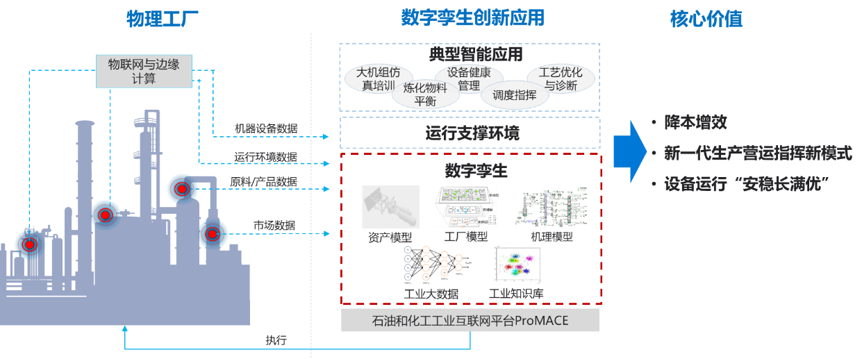 基于數字孿生的石化工業互聯網綜合應用案例依托石油和化工工業互聯網平臺ProMACE,由石化工業數字孿生體、運行環境和典型智能應用三部分組成。