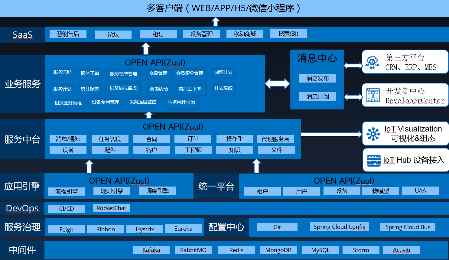 在平臺層:設備的數據傳送到平臺之后,對數據進行整理,提取有用的信息,并將相關的數據規整到服務中臺上面,通過不同模塊的功能提供給應用層來進行調用,提高功能模塊的復用性。
