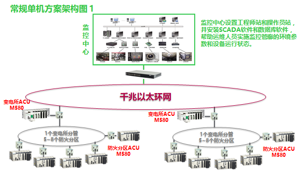 根據(jù)《城市綜合管廊工程技術(shù)規(guī)范GB 50838-2015》的要求,綜合管廊每200米劃分防火分區(qū),環(huán)境與設(shè)備監(jiān)控系統(tǒng)在每個防火分區(qū)內(nèi)會設(shè)置一臺ACU區(qū)域控制單元,負(fù)責(zé)綜合管廊現(xiàn)場防火分區(qū)范圍內(nèi)的信號采集、控制信號輸出和遠(yuǎn)程通信等任務(wù),一臺ACU通常由工業(yè)級的可編程邏輯控制器PLC、工業(yè)以太網(wǎng)交換機(jī)、UPS和控制機(jī)柜等幾部分組成。