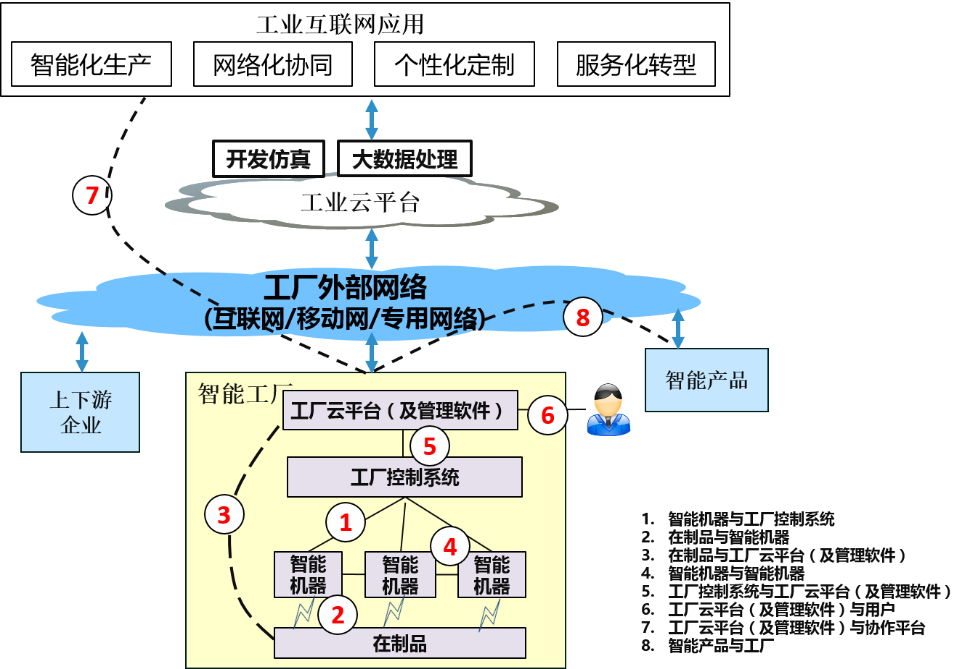 本方案在工業(yè)互聯(lián)網(wǎng)網(wǎng)絡(luò)體系架構(gòu)中,覆蓋智能機(jī)器與工廠控制系統(tǒng),工廠控制系統(tǒng)與工廠云平臺(及管理軟件)。詳見工業(yè)互聯(lián)網(wǎng)體系架構(gòu)圖中的1,5兩部分。