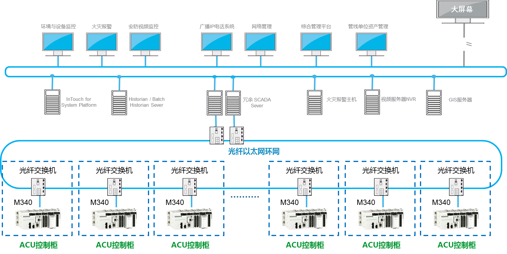首鋼園區(qū)綜合管廊一期工程涵蓋首鋼園區(qū)秀池南街和秀池西路。首鋼園區(qū)綜合管廊收納了電力、電信、給水、熱力等市政管線,管廊總長約750米,兩艙設(shè)計(綜合艙、電力艙),設(shè)1個監(jiān)控中心(含弱電機(jī)房)、14個防火分區(qū)。綜合管廊采用M340 PLC作為環(huán)境與設(shè)備監(jiān)控系統(tǒng)的現(xiàn)地區(qū)域控制器。在管廊沿線弱電設(shè)備間內(nèi)設(shè)置一臺ACU(內(nèi)含一臺千兆以太網(wǎng)交換機(jī),一套數(shù)據(jù)采集控制單元,一套UPS);每個防火區(qū)間設(shè)置一套現(xiàn)場控制箱ACU(內(nèi)含一臺千兆以太網(wǎng)交換機(jī)、一套數(shù)據(jù)采集控制單元、一套UPS)。