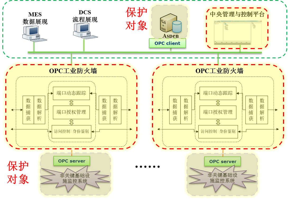 新興鑄管廠的OPC工業(yè)防火墻安全防護的總體架構(gòu)如圖所示,OPC工業(yè)防火墻保護每個控制系統(tǒng)區(qū)域,部署在控制系統(tǒng)區(qū)域出口,進行區(qū)域隔離,避免病毒擴散,對OPC協(xié)議進行解析、動態(tài)端口管理、完整性檢查等,避免病毒攻擊。安全管控平臺為統(tǒng)一的集中管理OPC工業(yè)防火墻,部署在同Aspen數(shù)據(jù)庫同一層,對整個工業(yè)智能控制網(wǎng)絡進行實時監(jiān)控,對報警及消息日志進行歷史存儲與分析。