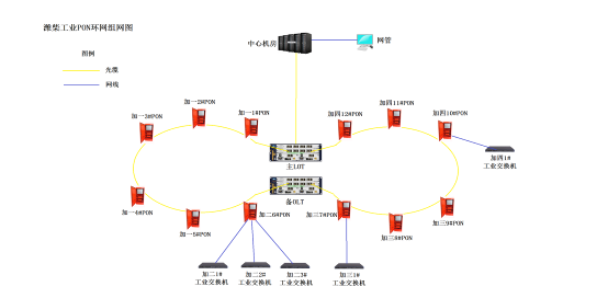 工業(yè)PON網(wǎng)絡的拓撲結(jié)構(gòu)可與各車間信息節(jié)點無縫結(jié)合,可根據(jù)需要組成多鏈路備份的樹形結(jié)構(gòu)、環(huán)形結(jié)構(gòu)等傳送網(wǎng)絡。網(wǎng)絡拓撲圖如下所示: