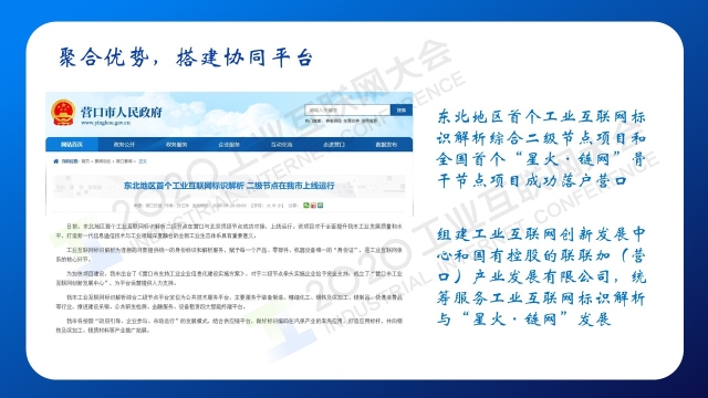 “營口將發揮好“船小好調頭”的特點,在工業互聯網、區塊鏈等技術、新模式上創新探索,努力形成典型經驗,為東北地區乃至全國提供有價值的樣本參考。一是通過標識解析+區塊鏈,打造智能制造之城;二是通過VR+虛擬園區,打造虛擬現實之城;三是通過可信標識+數字貨幣,打造數字金融之城;四是通過城市大腦加神經網絡,打造智慧治理之城。”