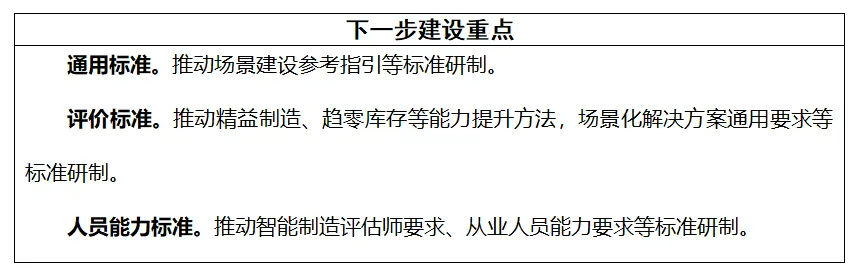 主要包括指標(biāo)體系、評價(jià)方法、解決方案等3個(gè)部分。指標(biāo)體系標(biāo)準(zhǔn)主要包括制造企業(yè)實(shí)施智能制造的績效評價(jià)指標(biāo)、供應(yīng)商提供的智能制造服務(wù)能力水平等標(biāo)準(zhǔn)。評價(jià)方法標(biāo)準(zhǔn)主要包括成熟度模型、評價(jià)過程、結(jié)果判定等標(biāo)準(zhǔn)。解決方案標(biāo)準(zhǔn)主要包括基于評價(jià)結(jié)果企業(yè)智能制造能力提升方法、場景化解決方案通用要求等標(biāo)準(zhǔn)。