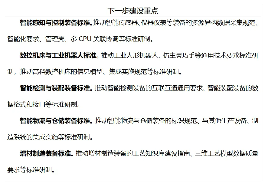 主要包括智能檢測與裝配裝備的組成要素、參數(shù)配置、功能和性能要求等通用技術(shù)標(biāo)準(zhǔn);數(shù)據(jù)接口、適配要求、集成規(guī)范等接口與通信標(biāo)準(zhǔn)。