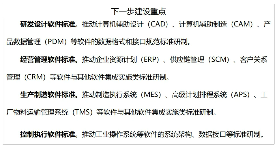 主要包括制造執(zhí)行系統(tǒng)(MES)、高級計(jì)劃排程系統(tǒng)(APS)、工廠物料運(yùn)輸管理系統(tǒng)(TMS)、能源管理系統(tǒng)(EMS)、故障預(yù)測與健康管理軟件(PHM)、運(yùn)維綜合保障管理(MRO)等生產(chǎn)制造軟件應(yīng)用指南和集成實(shí)施標(biāo)準(zhǔn)。