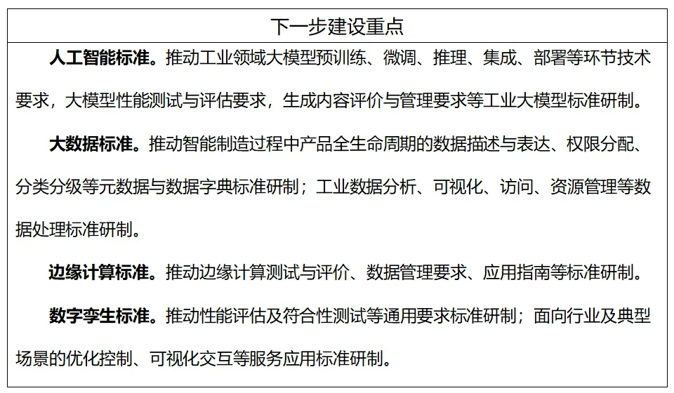 主要包括面向工業(yè)領(lǐng)域的大模型、機(jī)器學(xué)習(xí)、知識(shí)圖譜的參考架構(gòu)、系統(tǒng)要求、性能要求、測試方法、數(shù)據(jù)訓(xùn)練及生成內(nèi)容評價(jià)等通用要求標(biāo)準(zhǔn);面向工業(yè)領(lǐng)域重點(diǎn)行業(yè)及典型場景的模型、算法、知識(shí)及系統(tǒng)的集成、部署、應(yīng)用、管理和運(yùn)維等服務(wù)應(yīng)用標(biāo)準(zhǔn)。