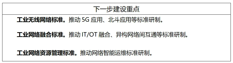 工業(yè)無線網(wǎng)絡(luò)標(biāo)準(zhǔn)主要包括無線局域網(wǎng)(WLAN)、無線可尋址遠(yuǎn)程傳感器高速通道(WirelessHART)、用于工廠自動(dòng)化/過程自動(dòng)化的工業(yè)無線網(wǎng)絡(luò)(WIA-FA/PA)、窄帶物聯(lián)網(wǎng)(NB-IoT)、5G應(yīng)用、北斗應(yīng)用等標(biāo)準(zhǔn)。工業(yè)有線網(wǎng)絡(luò)標(biāo)準(zhǔn)主要包括現(xiàn)場總線、工業(yè)以太網(wǎng)、工業(yè)無源光纖網(wǎng)絡(luò)(xPON)、工業(yè)綜合布線、單對線以太網(wǎng)等標(biāo)準(zhǔn)。工業(yè)網(wǎng)絡(luò)融合標(biāo)準(zhǔn)主要包括確定性網(wǎng)絡(luò)(DetNet)、時(shí)間敏感網(wǎng)絡(luò)(TSN)、信息技術(shù)/運(yùn)營技術(shù)(IT/OT)融合、異構(gòu)網(wǎng)絡(luò)間互通、IPv6+、高可靠組網(wǎng)等標(biāo)準(zhǔn)。工業(yè)網(wǎng)絡(luò)資源管理標(biāo)準(zhǔn)主要包括網(wǎng)絡(luò)地址管理、網(wǎng)絡(luò)頻譜管理、網(wǎng)絡(luò)智能運(yùn)維等標(biāo)準(zhǔn)。