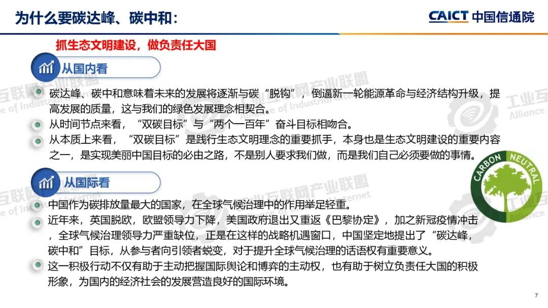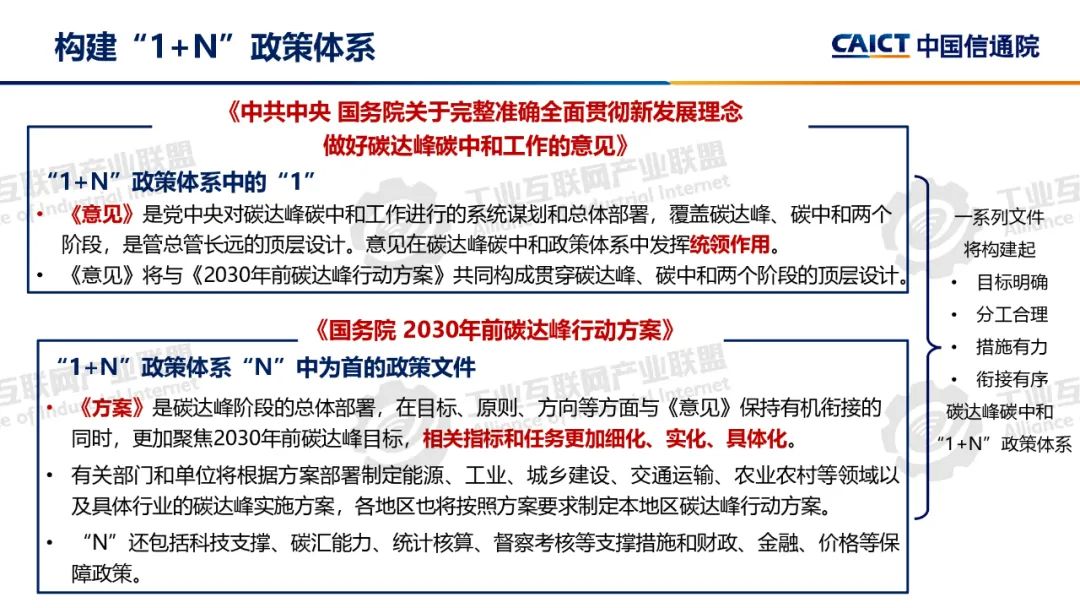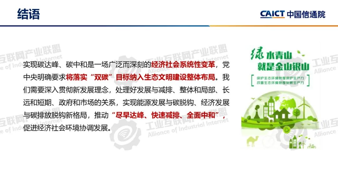 本期為您介紹由中國信息通信研究院泰爾終端實驗室副總工盧春陽分享的《碳達峰碳中和基礎知識和政策解讀》。盧春陽講解了碳達峰碳中和的科學內涵、經濟內涵和重要意義,分析了國內外能源消費結構和我國碳排放的現狀,以及碳達峰碳中和面臨的挑戰,解讀了我國碳達峰碳中和“1+N”政策體系,重點講解了《2030年前碳達峰行動方案》具體重點行動以及工業、建材和有色行業碳達峰實施方案的主要內容。