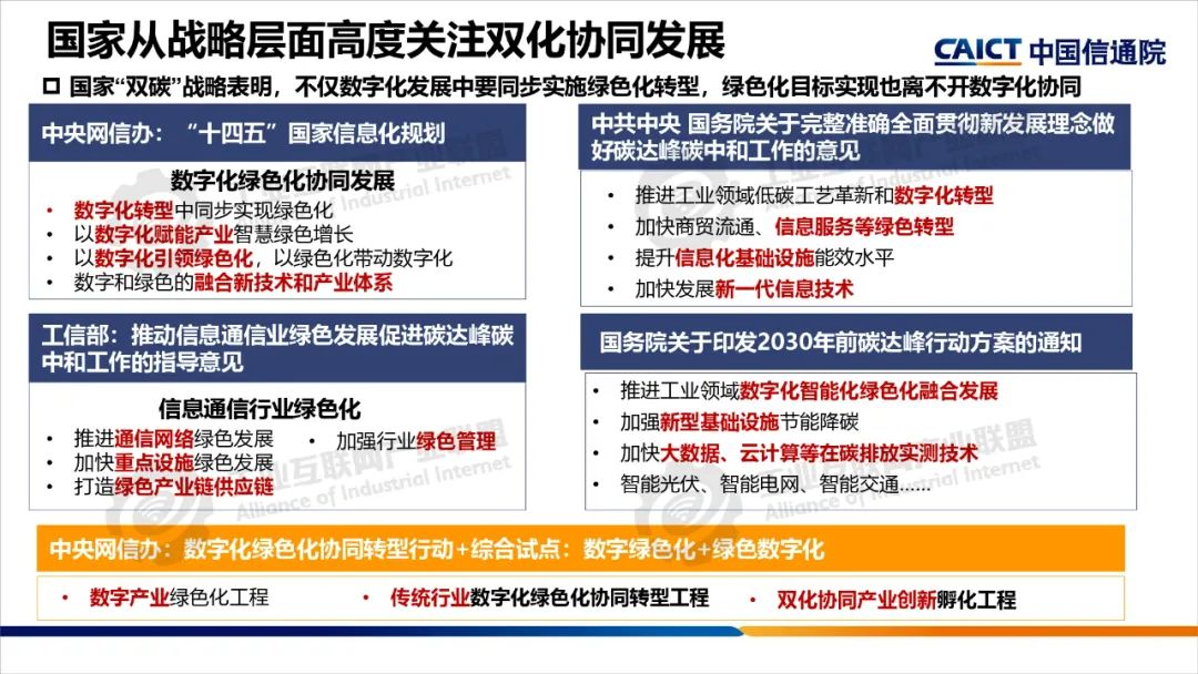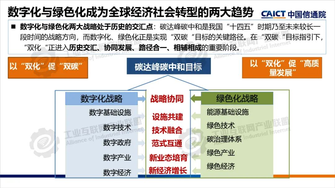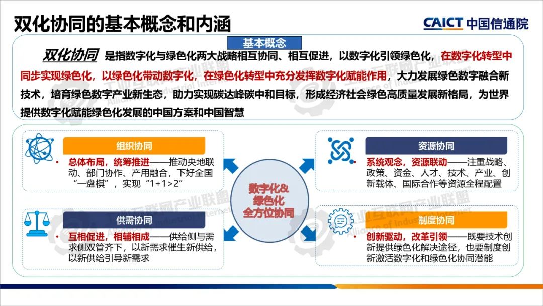 本期為您帶來(lái)由中國(guó)信息通信研究院產(chǎn)業(yè)與規(guī)劃研究所高級(jí)工程師王婧媛分享的《數(shù)字化綠色化協(xié)同轉(zhuǎn)型綜合試點(diǎn)建設(shè)解讀》。數(shù)字化轉(zhuǎn)型和綠色化轉(zhuǎn)型不僅是當(dāng)今世界發(fā)展的兩大主題,也是相互依存、相互促進(jìn)的孿生體。“雙化協(xié)同”是指數(shù)字化與綠色化兩大戰(zhàn)略相互協(xié)同、相互促進(jìn),在數(shù)字化轉(zhuǎn)型中同步實(shí)現(xiàn)綠色化,以綠色化帶動(dòng)數(shù)字化,在綠色化轉(zhuǎn)型中充分發(fā)揮數(shù)字化賦能作用,大力發(fā)展綠色數(shù)字融合新技術(shù),培育綠色數(shù)字產(chǎn)業(yè)新生態(tài)。