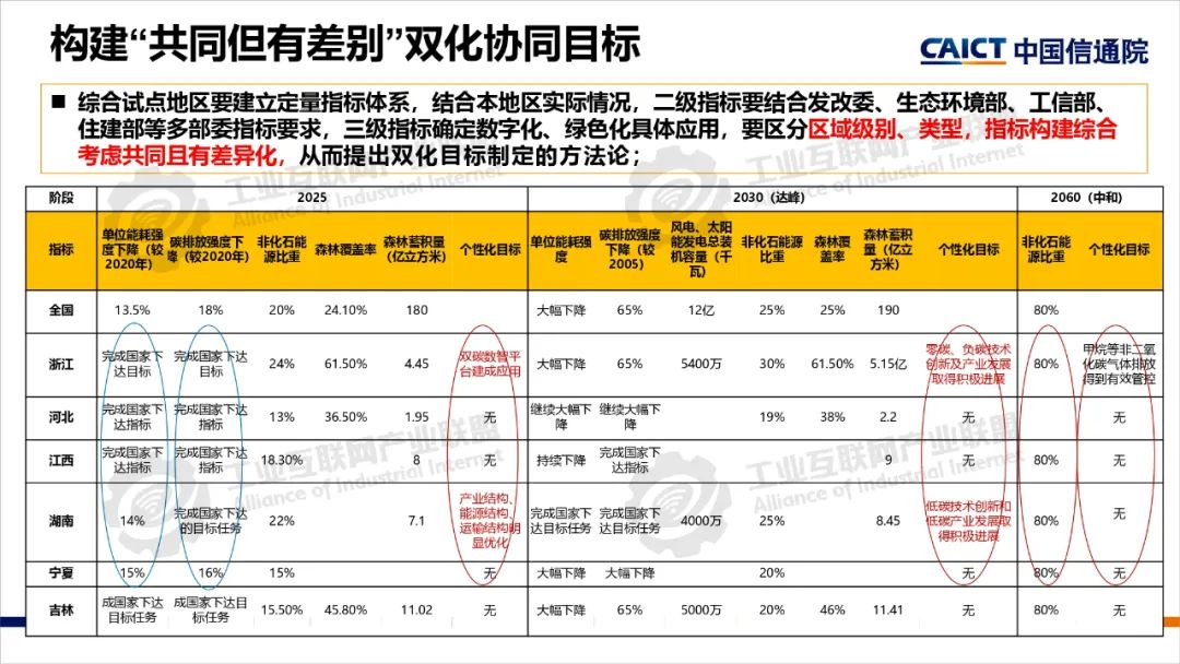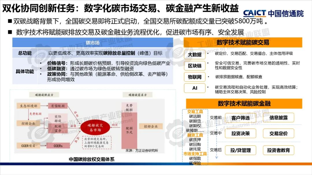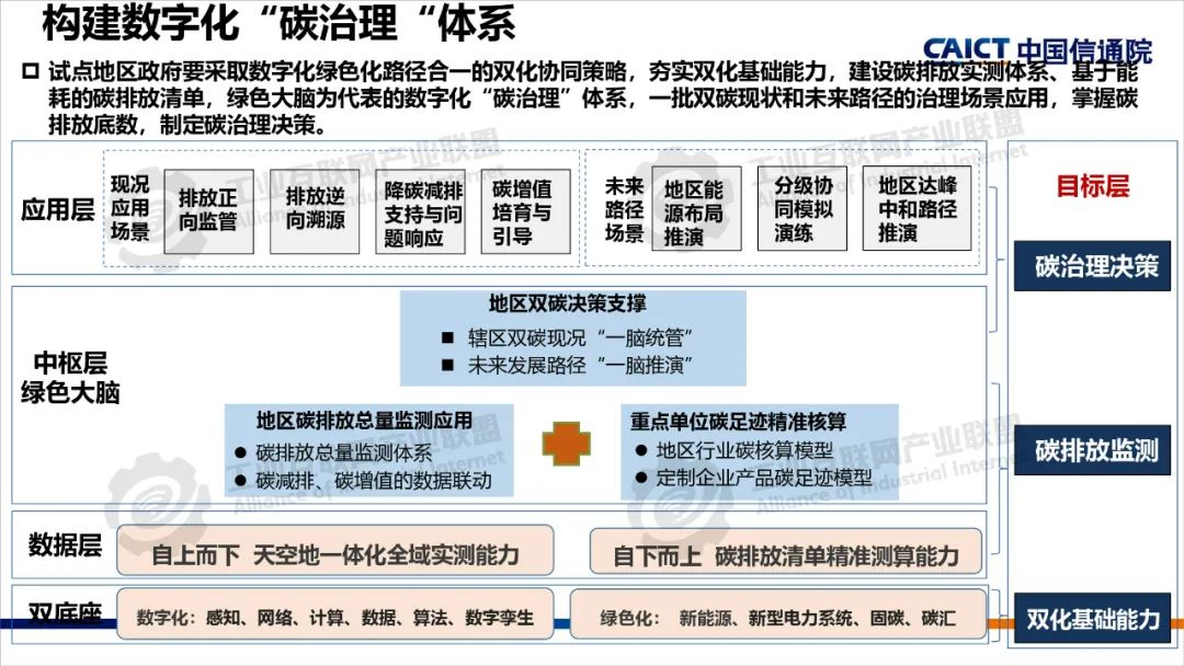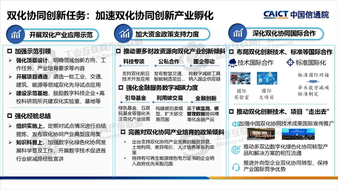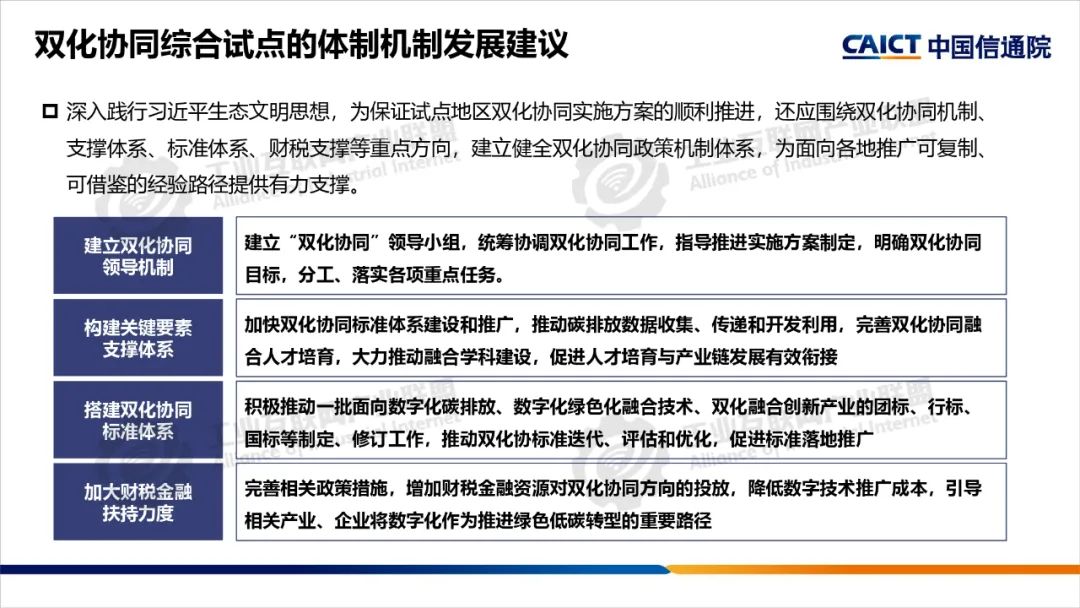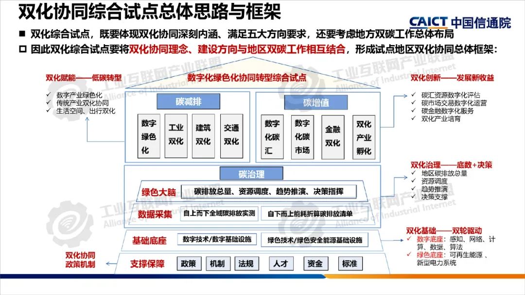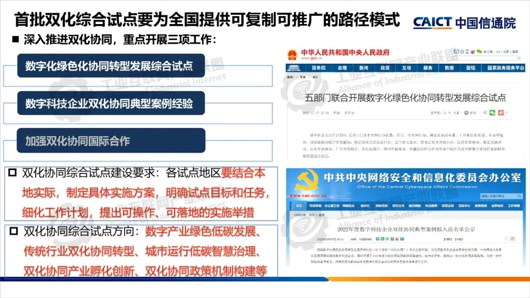 2022年,中央網(wǎng)信辦等五部門聯(lián)合開展了雙化協(xié)同綜合試點(diǎn)建設(shè),要求各試點(diǎn)地區(qū)制定具體實(shí)施方案,部署了五大建設(shè)方向。雙化綜合試點(diǎn)地區(qū)要將雙化協(xié)同理念、建設(shè)方向與地區(qū)雙碳工作相互結(jié)合,從打造數(shù)字底座+綠色底座夯實(shí)雙化基礎(chǔ),以雙化治理探明地區(qū)碳排放底數(shù)、支撐決策治理,以雙化賦能實(shí)現(xiàn)數(shù)字產(chǎn)業(yè)綠色化、傳統(tǒng)產(chǎn)業(yè)和生活低碳化,以雙化創(chuàng)新開展數(shù)字化生態(tài)資源、碳市場(chǎng)和碳金融的高效價(jià)值轉(zhuǎn)化,培育雙化新技術(shù)、新產(chǎn)業(yè),最后還要配套雙化協(xié)同政策、要素、標(biāo)準(zhǔn)、財(cái)稅等機(jī)制創(chuàng)新。