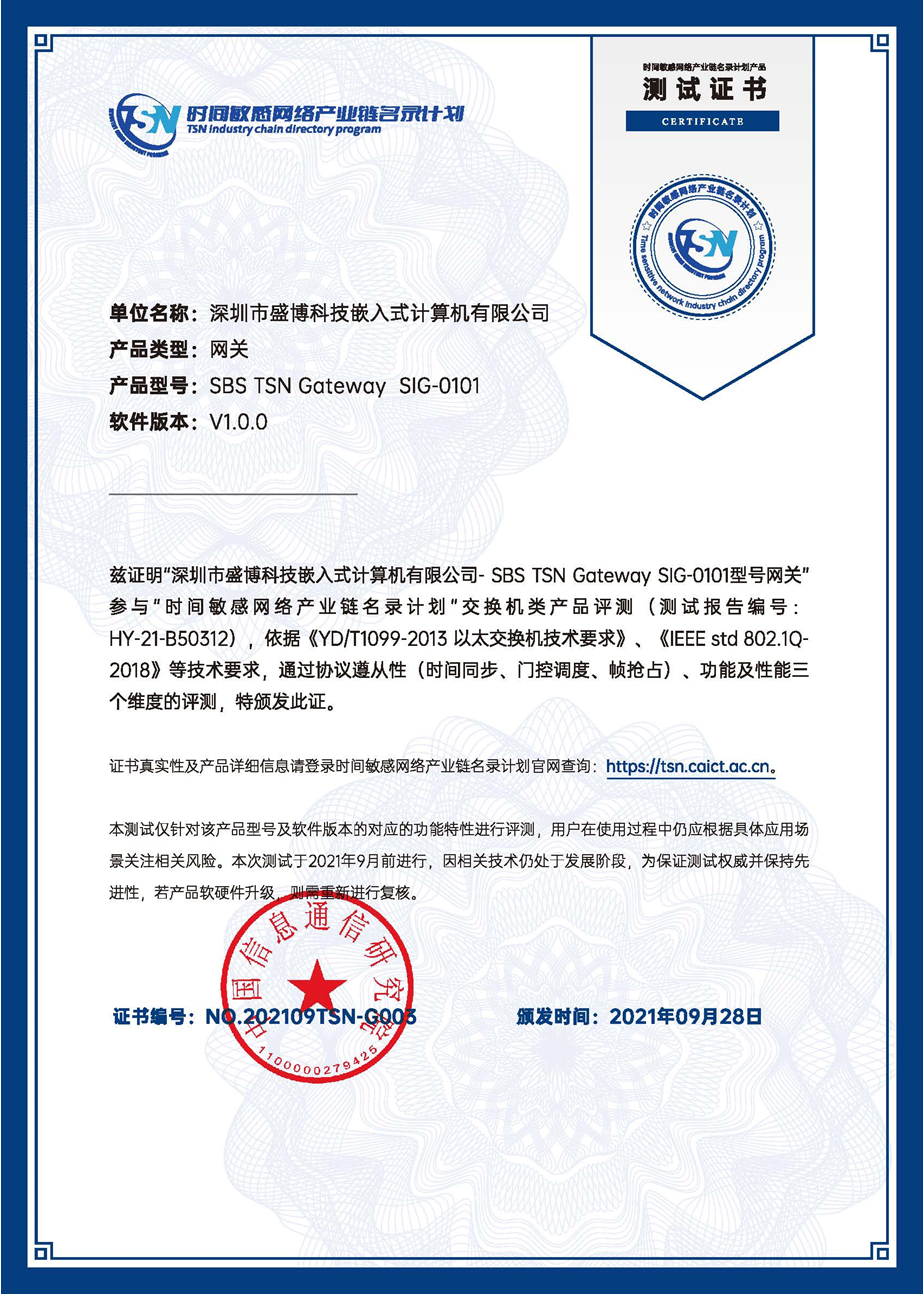 2021年9月,深圳市盛博科技嵌入式計(jì)算機(jī)有限公司研發(fā)的SIG-0101網(wǎng)關(guān)在互聯(lián)網(wǎng)與工業(yè)融合創(chuàng)新工信部重點(diǎn)實(shí)驗(yàn)室順利通過“TSN產(chǎn)業(yè)鏈名錄計(jì)劃”產(chǎn)品測試,獲得網(wǎng)關(guān)類測試證書,成為第一批加入產(chǎn)業(yè)鏈名錄計(jì)劃的產(chǎn)品。