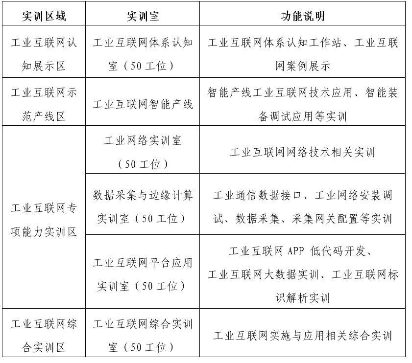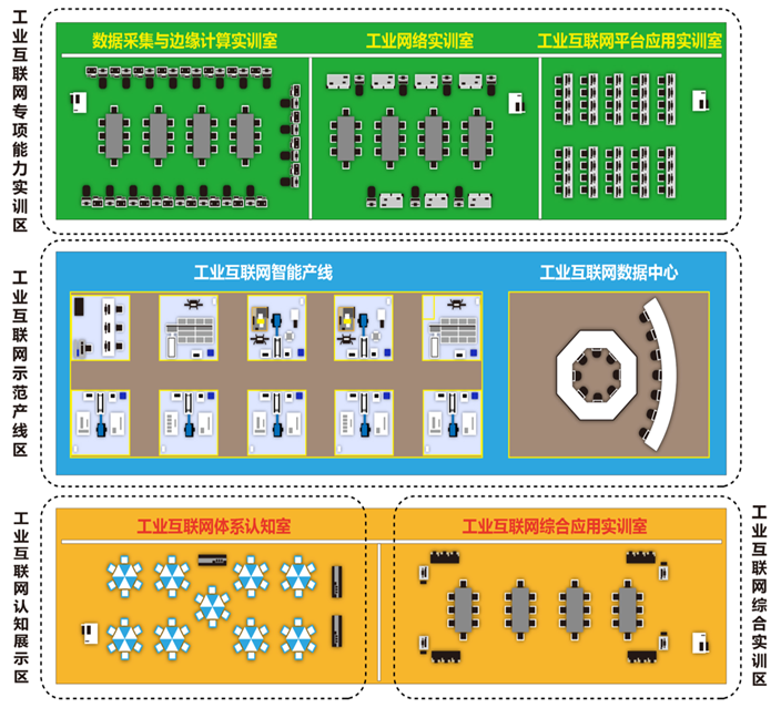 工業(yè)互聯(lián)網(wǎng)綜合實訓(xùn)區(qū)域:工業(yè)互聯(lián)網(wǎng)綜合實訓(xùn)區(qū)將實現(xiàn)典型工業(yè)產(chǎn)線的自動化控制、數(shù)據(jù)采集與應(yīng)用、定制化生產(chǎn)、云邊協(xié)同制造等場景,支持工業(yè)互聯(lián)網(wǎng)綜合實訓(xùn)教學(xué),讓學(xué)生基本具備工業(yè)互聯(lián)網(wǎng)實施與應(yīng)用的綜合能力。