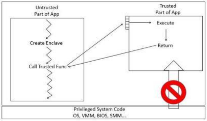 SGX允許用戶態及內核態代碼定義將特定內存區域,設置為私有區域,此區域也被稱為飛地(Enclave)。其內容受到保護,不能被本身以外的任何進程存取,包括高權限級別運行的進程(例如操作系統內核進程)。
