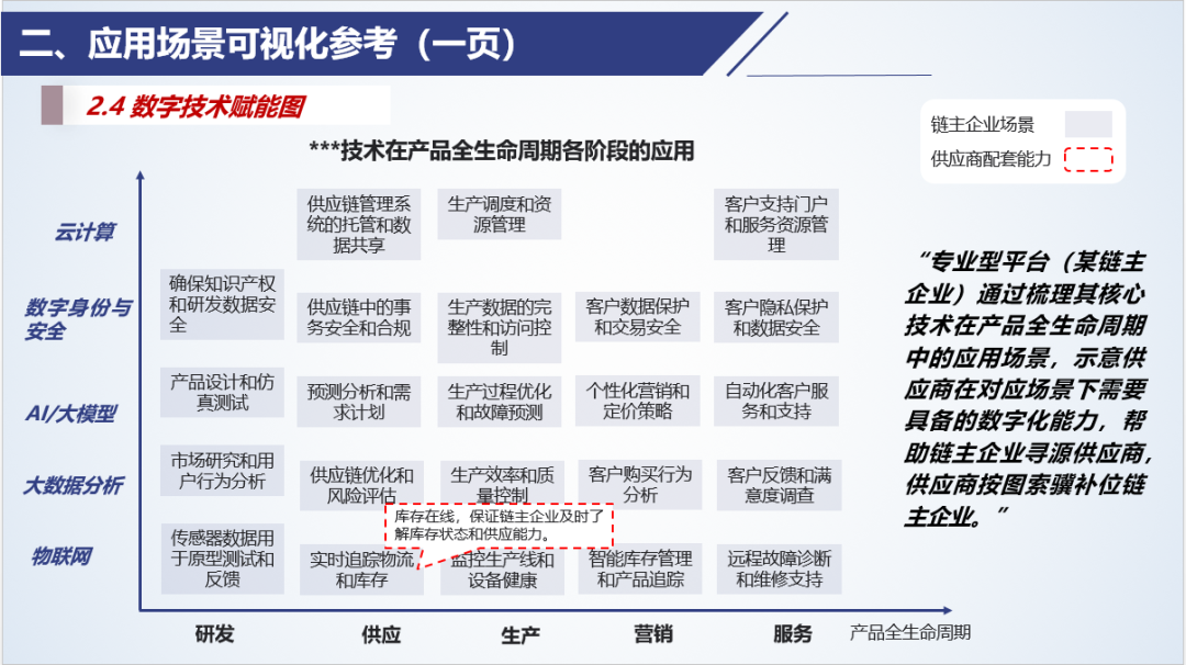 對于制造業行業(如航空航天、汽車、家電等)的鏈主企業,結合數字化轉型以及傳統的企業經營、供應鏈競爭、生態構建等策略,適合采用的應用場景地圖示例如下: