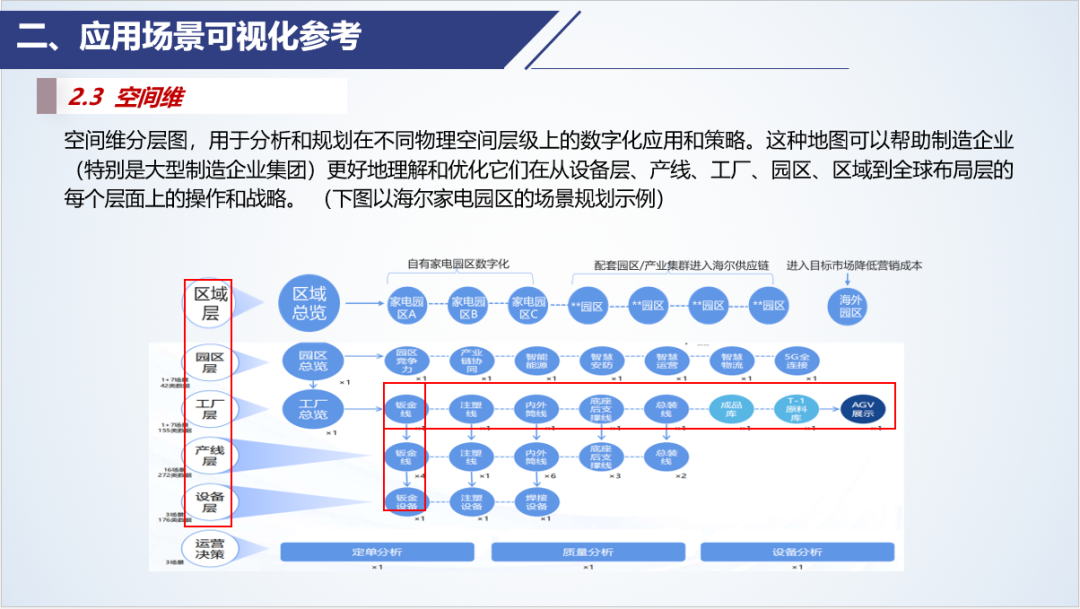 應用場景地圖則關注于微觀層面,通過匯聚零散場景,按研供產銷服產品生命周期、設備/產線/工廠/園區/區域等的企業空間布局、物聯/大數據/AI大模型等技術賦能等維度,為復雜場景組合提供清晰、易于理解的視圖,系統化綜合展示特定或多項產品或服務在不同環境中的應用情況,旨在描繪和解釋業務或技術場景的組合及其復雜關系,特別適用于那些涉及多方利益相關者、跨領域知識和多層次需求的復雜環境。