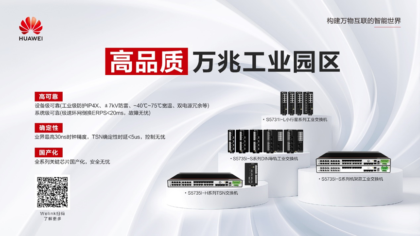 華為高品質萬兆工業園區網絡解決方案,面向“工業4.0”產業趨勢,以體驗為中心,以高可靠、確定性網絡為技術基礎,從傳統OT現場生產網,擴展到生產IT&OT融合一張網,疊加“極致高可靠”、“工業靈活接入”、“生產智能運維”3大技術體系,打造自主可控“TSN+”高品質萬兆工業園區網絡,助力工業數字化、智能化高質量發展。例如:CloudEngine S5735I-S-V2系列工業交換機無風扇散熱,IP4X防護等級,防止粉塵侵擾,滿足光伏拉晶車間對灰塵的嚴格控制要求;CloudEngine S5735I-H-V2系列TSN交換機支持us級確定性時延、網絡自編排,滿足產線PLC遠程集中部署,實現高效運維、安全調試;CloudEngine S1710I-S系列工業數采網關支持多種工業協議數據的采集(485、232、DI/DO、AI等),支持LTE/以太/Wi-Fi等按需的數據回傳。疊加NCE統一管理運維,滿足工業設備可視化管理需求,提升設備網聯率,讓設備“開口說話”,加速數據變現,助力企業生產效率提升。