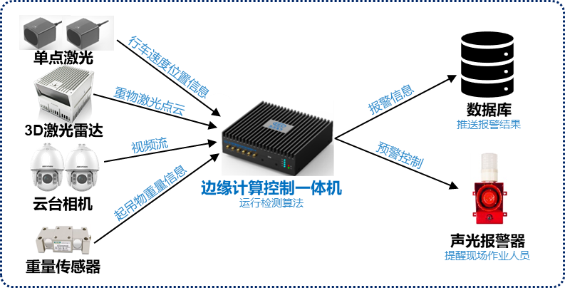 重物起吊是車間中最常見的高風(fēng)險作業(yè)場景,東方研究院基于EC13211研發(fā)了重物起吊作業(yè)安全預(yù)警系統(tǒng),控制器安裝于行車上,就近接入單點(diǎn)激光、3D激光雷達(dá)、工業(yè)攝像頭和其他傳感器,進(jìn)行實(shí)時的數(shù)據(jù)采集、姿態(tài)感知和AI視覺處理,具有較高的檢測實(shí)時性。系統(tǒng)可在起吊作業(yè)過程中對吊運(yùn)物下方站人和吊運(yùn)物前進(jìn)方向有人等安全風(fēng)險進(jìn)行智能識別與安全預(yù)警,提醒行車駕駛員及時停止作業(yè),并上傳報警信息。該系統(tǒng)集起吊作業(yè)監(jiān)控、風(fēng)險預(yù)警、違規(guī)報警于一體,極大地降低了重物起吊作業(yè)中的安全風(fēng)險。
