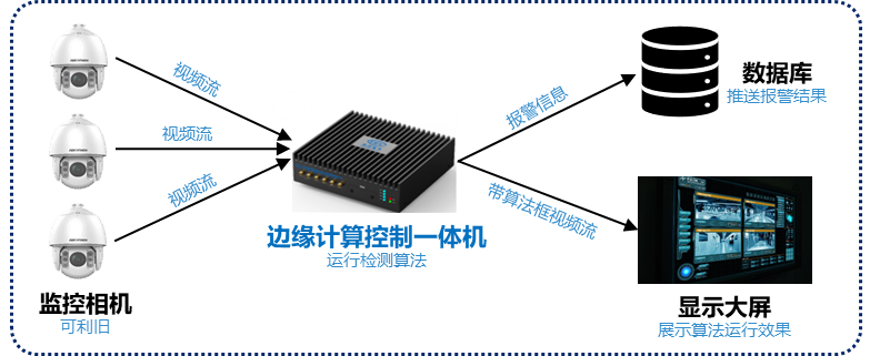 生產(chǎn)車間場景復(fù)雜多變,其中存在一些常見的車間人員不安全行為,如登梯未扶梯、未佩戴安全帽、未正確穿戴工服、作業(yè)場所吸煙以及作業(yè)中看手機(jī)等,這些行為極有可能引起重大安全事故。東方研究院針對以上實(shí)際生產(chǎn)場景中可能存在的安全風(fēng)險行為,基于EC13211研發(fā)了生產(chǎn)車間不安全行為智能識別系統(tǒng),控制器分布式布置于車間多個位置,就近進(jìn)行攝像頭的視頻采集和AI處理,支持同時檢測多路視頻流、多種智能算法,高效利用硬件資源,同時降低車間帶寬壓力,實(shí)現(xiàn)廣域車間全覆蓋。該系統(tǒng)能夠?qū)崟r發(fā)現(xiàn)、展示并上傳不安全行為報警信息,通過短信提醒指定安全員進(jìn)行處理,有效降低了車間中可能存在的相關(guān)安全風(fēng)險。