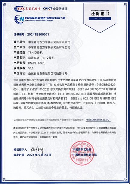 2024年9月,中車青島四方車輛研究所有限公司(以下簡稱中車四方所)研發(fā)的RN-DEH-G28型軌道車輛TSN交換機,在互聯(lián)網與工業(yè)融合創(chuàng)新工信部重點實驗室順利通過名錄計劃產品評測,獲得交換機類檢測證書。